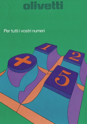 Un altro manifesto di Ballmer (1971), in stile completamente diverso, presenta alcuni tasti di una calcolatrice – potrebbe essere elettromeccanica o elettronica – accompagnati dalla scritta “per tutti i vostri numeri”: anche in questo caso il riferimento non è a un prodotto specifico, ma alla capacità della Olivetti di soddisfare tutte le esigenze di calcolo.