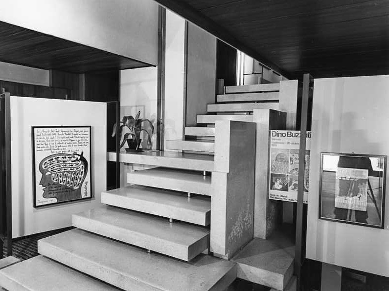 Il negozio, realizzato nel 1957-58 dall’architetto Carlo Scarpa (1902-1978) sotto i portici delle Procuratie Vecchie in piazza San Marco, viene utilizzato anche per esposizione d’arte di alto livello. Nel 1978 l’Olivetti organizza nel negozio una bella mostra dedicata al giornalista, scrittore e pittore bellunese Dino Buzzati (1906-1972). Nella foto, la scala interna del negozio, con la locandina della mostra e due delle opere esposte.